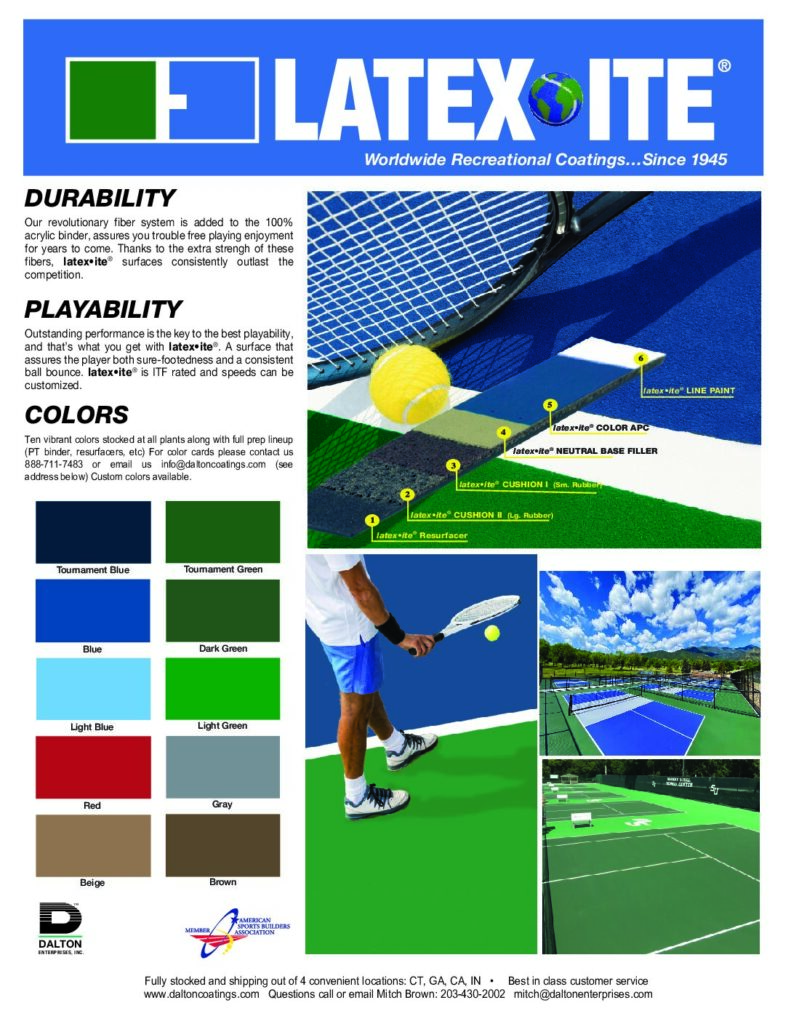 All purpose color, high solid acrylic latex concentrate. It is fortified with fine mineral fillers and acrylic resins. Color-fast pigments with an advance latex produce a richer, better yielding, longer lasting, in-depth color. Available stocked concentrate colors: Tournament Blue, Tournament Green, Dark Green, Light Green, Blue, Light Blue, Red, Gray, Beige, Brown. Custom colors available and speed specifications sent with order (i.e. medium-slow, medium, medium-fast). ITF Rated.