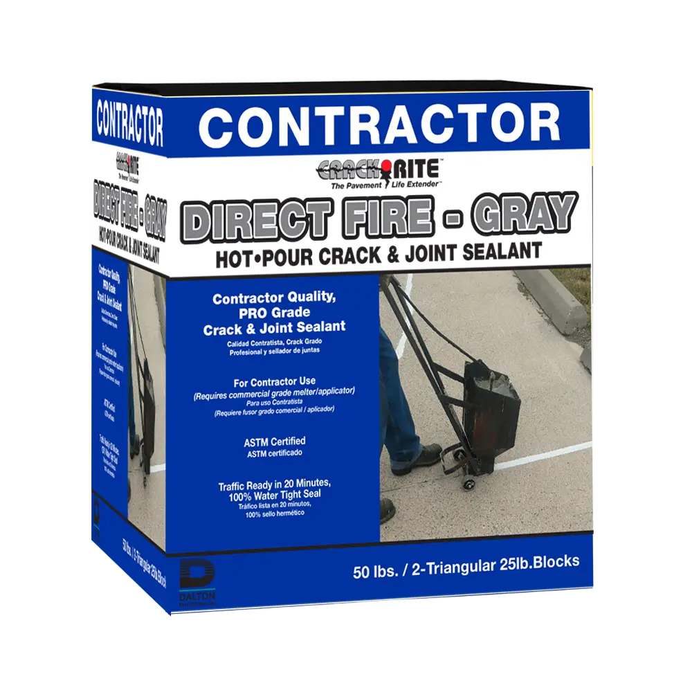 Crack Rite DIRECT FIRE-Gray is a superior quality, hot-applied crack and joint sealant that is will work on either concrete or asphalt. It consists of a special blend of resins, thermoplastic polymer rubber and stabilizers. DIRECT FIRE-GRAY can be heated in direct fired or single walled melted kettles. Will not track or bleed.