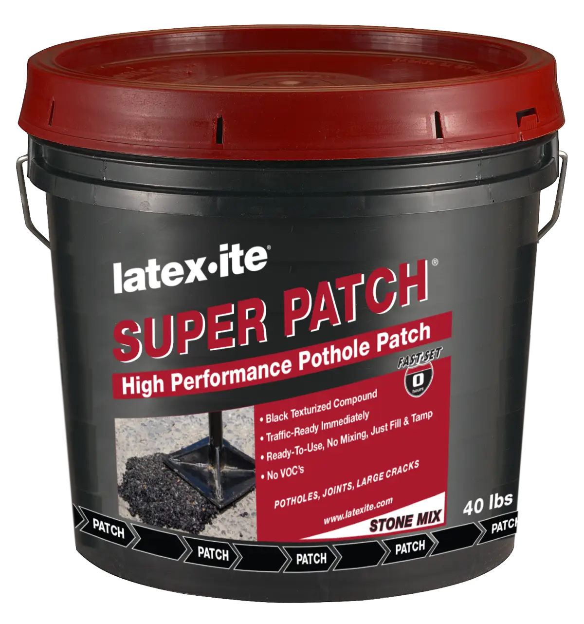 Latex·ite Super Patch® is a stone asphalt patch for driveways and pavements. It is recommended for POTHOLES, large cracks and joints. It can be used on both asphalt and concrete and is designed to be used year-round. Super Patch® (1 gal. & 3.5 gal.) contains asphalastic binders which give it maximum adhesion and longer life.